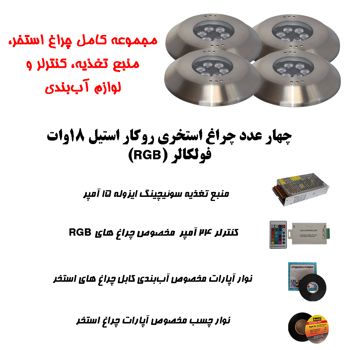 اگر بهدنبال یک راهکار کامل، ایمن، لوکس و هماهنگ برای نورپردازی استخرهای خانگی یا نیمهخصوصی با ابعادی تا حدود ۳۵ متر مربع هستید، پک کامل نورپردازی استخری LEDMAN دقیقاً همان چیزیست که نیاز دارید. این پک شامل چهار چراغ فولکالر استیل با طراحی حرفهای، ترانس ایزوله، کنترلر RGB با قابلیت مدیریت افکتها و نوار آپارات برای عایقکاری، توسط شرکت تهران کیت آماده و تست شده و آماده نصب میباشد.
