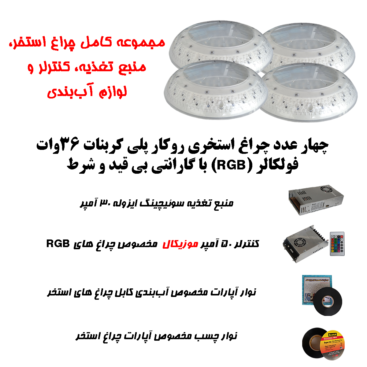 پک نورپردازی استخری پلیکربنات فولکالر ۳۶ وات – سیستم موزیکال حرفهای، یک راهحل کامل، هماهنگ و ایمن برای استخرهایی با مساحت متوسط تا بزرگ است. چراغهای RGB با بدنه مقاوم، کنترلر هماهنگ با موسیقی، ترانس ایزوله و تجهیزات جانبی مورد نیاز – همه در یک بسته. تأمینشده توسط شرکت تهران کیت و آماده برای نصب.